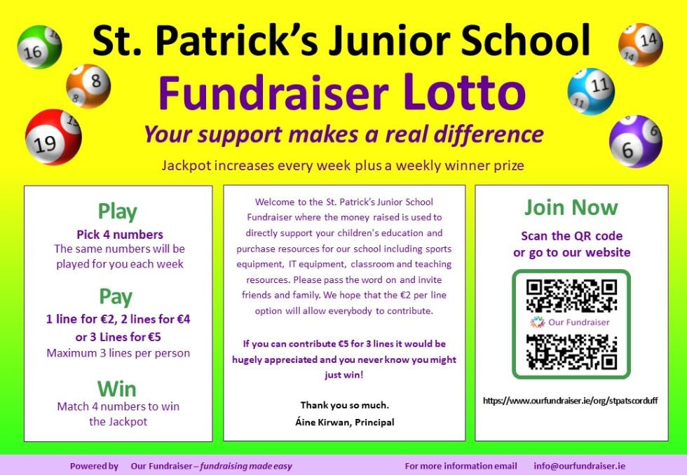 We are delighted to announce the launch of the St. Patrick’s Junior Lotto. This is a fundraising initiative and the money raised will be used to directly support your children's education and resources for our school including IT equipment, music equipment and school play areas.
